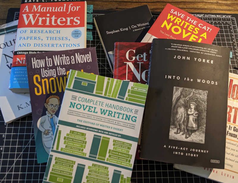 I needed help. Time for some research. I picked up a pile of books on storytelling and structure. Some were a bit "fluffy" in their approach, but still helpful. Others were good reads, but not overly helpful: Stephen King's On Writing comes to mind. But others were super helpful: Writer's Digest's The Complete Handbook of Novel Writing was particularly helpful and covered many many topics. How to Write a Novel using the Snowflake Method may be the best I have found on process. For help with structure, Into the Woods is my current favorite, though Save the Cat! was also very good, if a bit conflicting with the former (Save the Cat! was also a bit too cute on occasion). I am just starting to review some of K. M. Weiland's books on outlining and structure. She is often touted as the Queen of Structure, and if her insightful blog (and associated podcast) is any indication, I suspect that title is well deserved.