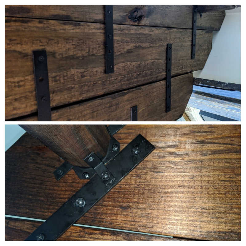The next step was to dismantle everything; stain the wood; spray-paint the chrome brackets flat-black; let it dry for a day or so; and then, reassemble the desk. Here's a picture of the brackets used to hold everything together. I thought I would have to use constructive adhesive as well, and maybe even 1x4's, but twelve 6-inch mending plates were sufficient.